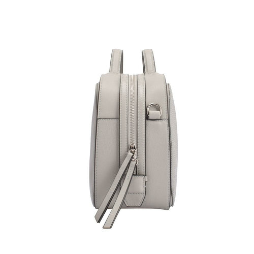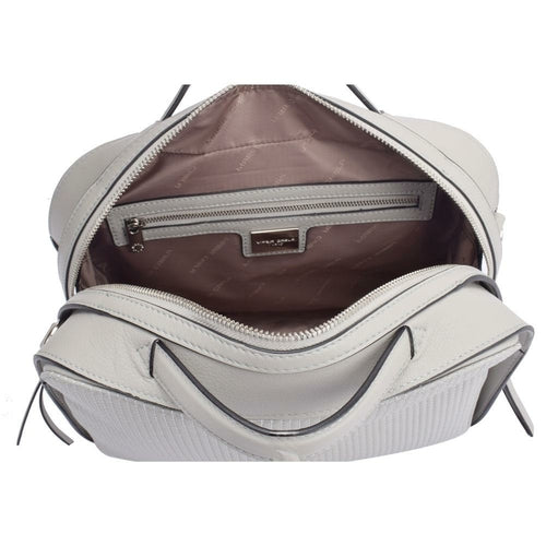Smooth leather with handle. Includes adjustable cross body/ shoulder strap. Main compartment with zip closure. Silver metal detailing.